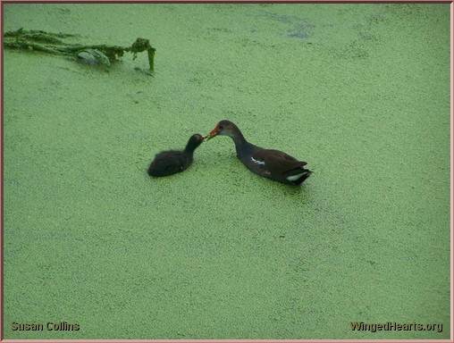 A Common Moorhen feeds one of her chick some of the green duckweed from the surface of the water.