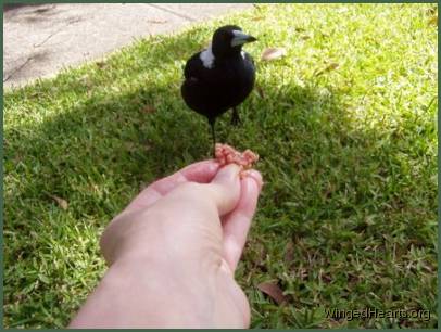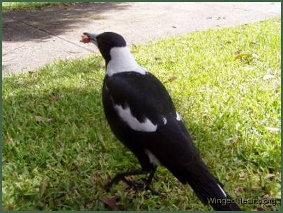 Here are some photos of my Maggie, I don’t know whether it’s a boy or a girl, but it’s very tame as it eats out of my hand. When it’s had enough mince, it gathers a big ball of mince up & runs across the yard to hide the ball for later on….just in case it gets hungry I guess!