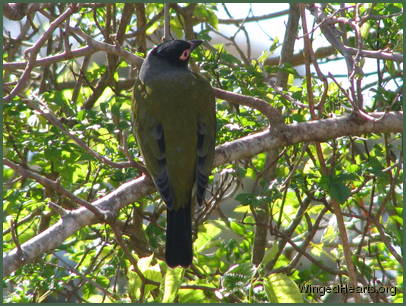 They are much bigger than the noisy-miners and from a distance seem to bear a closer resemblance to the dark brown Indian mynas, except for their colouring.  Their neck and chest are much darker with an almost metallic sheen while  their plumage is a deeper olive green.